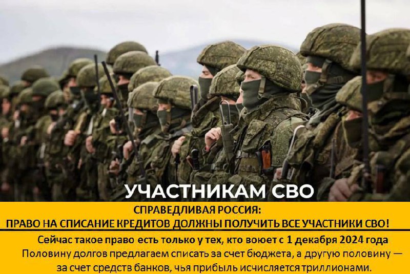 В СПРАВЕДЛИВУЮ РОССИЮ продолжают поступать обращения военнослужащих, участвующих в СВО. Один из вопросов, требующий немедленного решения, – устранение неравенства по условиям списания долговых обязательств. В отношении граждан, заключивших контракт о прохождении военной службы с 1 декабря 2024 года на срок свыше 1 года, исполнительные производства по кредитным обязательствам, в том числе ипотеке, прекращаются и "прощаются" долги до 10 млн. руб. А тем, кто заключил контракт о службе до этой даты, – нет. Это несправедливо. Недовольство понятно: закон, принятый в ноябре 2024 года, создает неравенство среди тех, кто воюет. Наша позиция неизменна: право на списание кредитов должны получить все участники СВО. Еще весной 2022 года мы подготовили законопроект, который предусматривал списание долгов для участников спецоперации. Половину долгов предлагалось списывать за счет бюджета, а другую половину – за счет средств банков, чья прибыль исчисляется триллионами. И наша партия будет добиваться принятия этого закона.